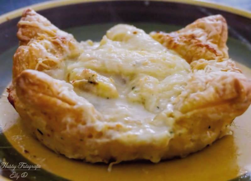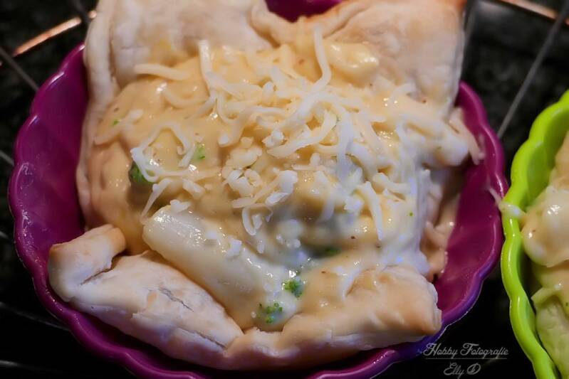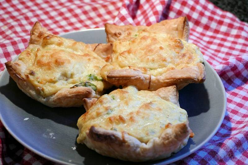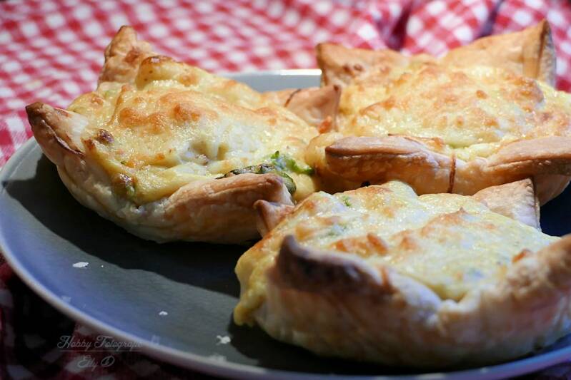 We halen de bakjes bladerdeeg uit de oven en doen een lepel van het aspergemengsel erbovenop