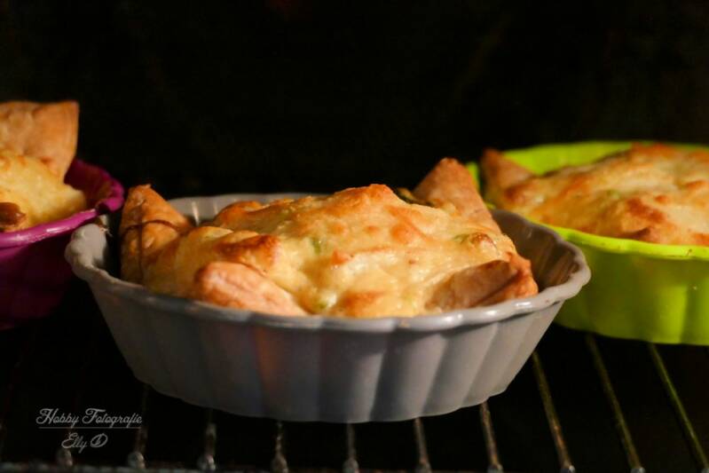 in de vormpjes doen en gaatjes met de vork in de bodem prikken van het bladerdeeg