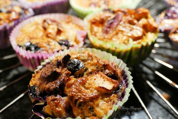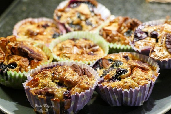 In de muffinvorm de stukjes appel wat bosbessen en stukjes walnoot leggen