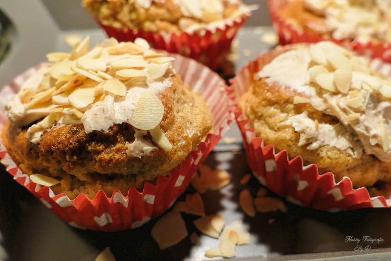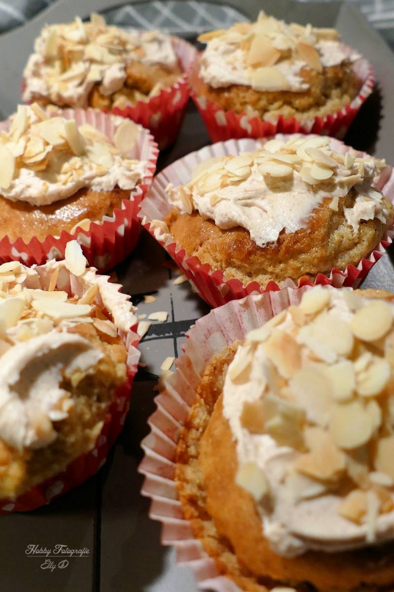 Als de cupcakes zijn afgekoeld de topping er wat op smeren en het amandelschaafsel er over strooien
