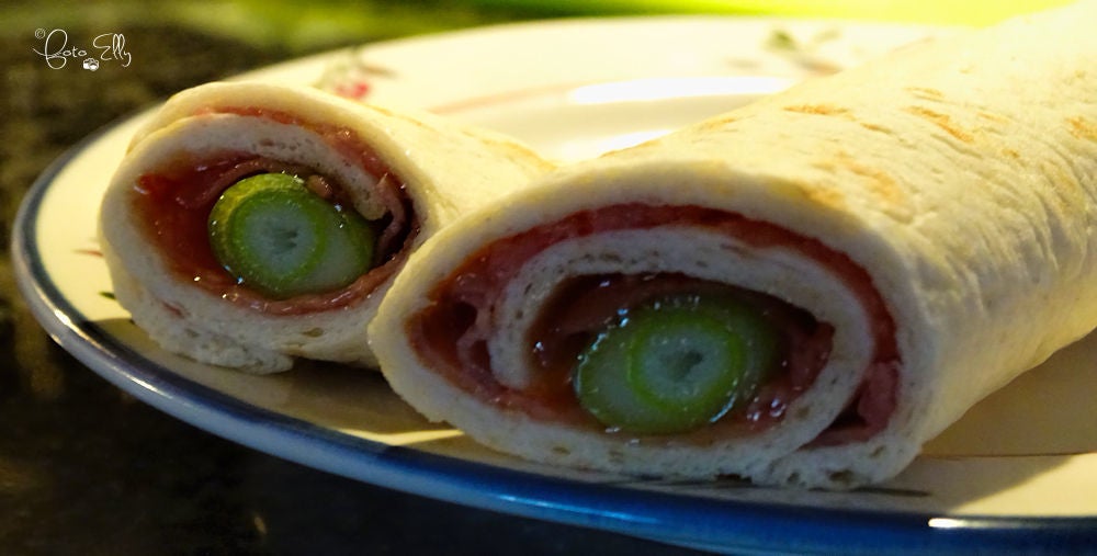 Voor de mensen die geen dieet hebben heb ik er ook een paar gemaakt met ham en de tortilla`s besmeerd met kruidenkaas en ijsbergsla ertussen met een lente ui ...die zullen het vanavond ook erg lekker vinden
