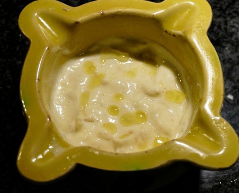 Op het laatst de olijfolie en die gaat er heel langzaam bij en goed blijven roeren