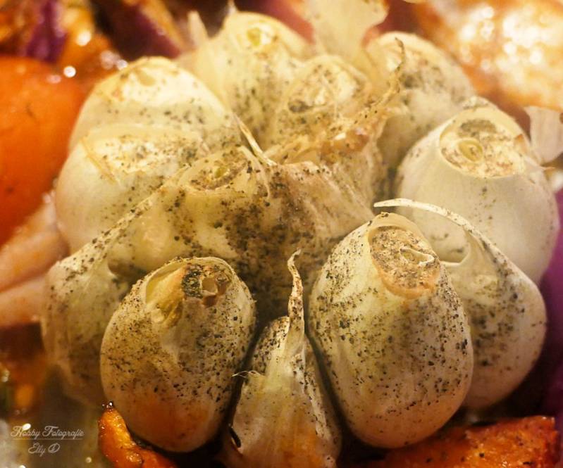 olijfolie erover en voor 3 kwartier in de oven laten poffen tot de knoflook zacht is.