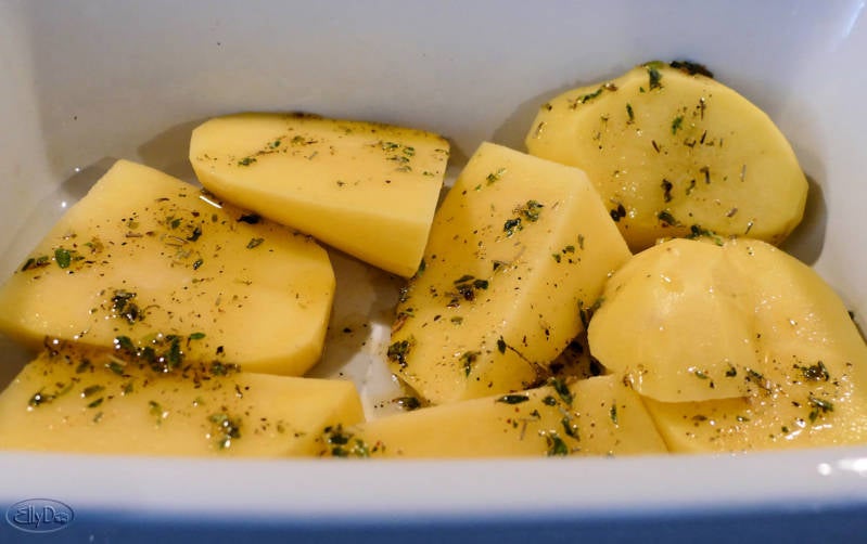 aardappels in grove stukken snijden en in de ovenschaal neerleggen