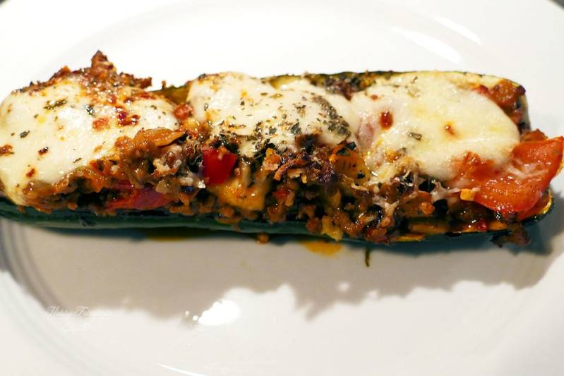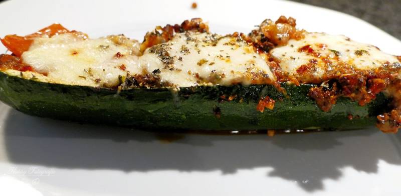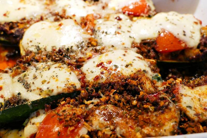 Na een kwartier de courgete uit de oven en vullen met het gehakt mengsel