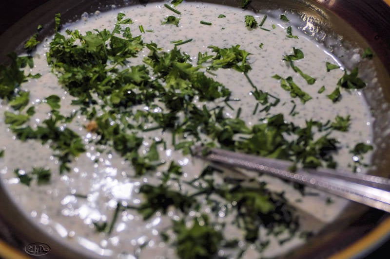 Zuivelspread met de room geraspte kaas goed mengen en de verse kruiden er doorheen roeren,,Ik doe de sjink er door