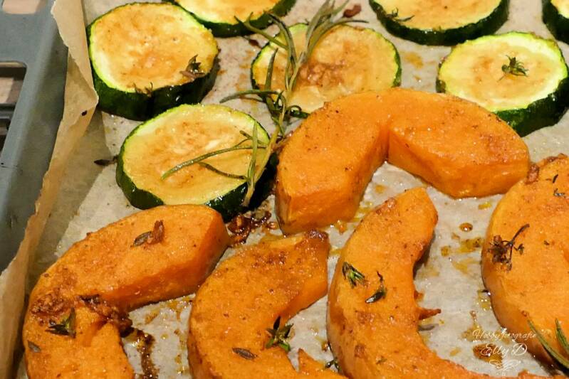strooi thym over de groente en leg er takjes rozemarijn tussen en plaats de plaat in de oven