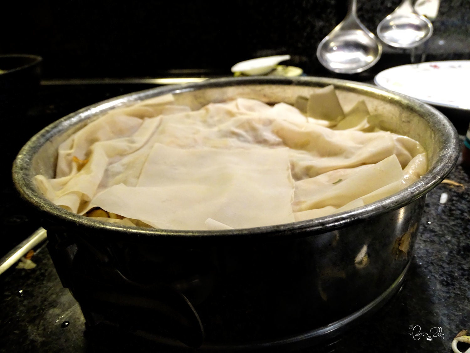 Groenten in de springvorm en leg het laatste lapje filodeeg over de groente met de flapjes van de zijkanten er overheen goed aandrukken en 45min in een oven van 175 graden