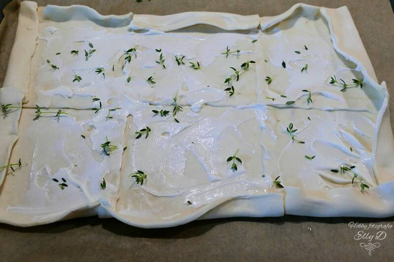 Op het ontdooide bladerdeeg crème fraiche smeren en verse thym op strooien