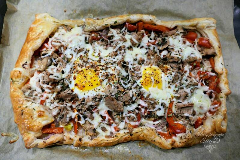 gesneden paprika ,en in plakjes gesneden champignons verdelen op de taart