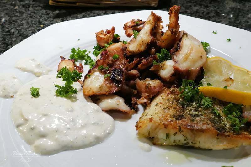 En kan de inktvis gebakken worden en tegelijkertijd de kabeljauw ...het is vlug klaar .