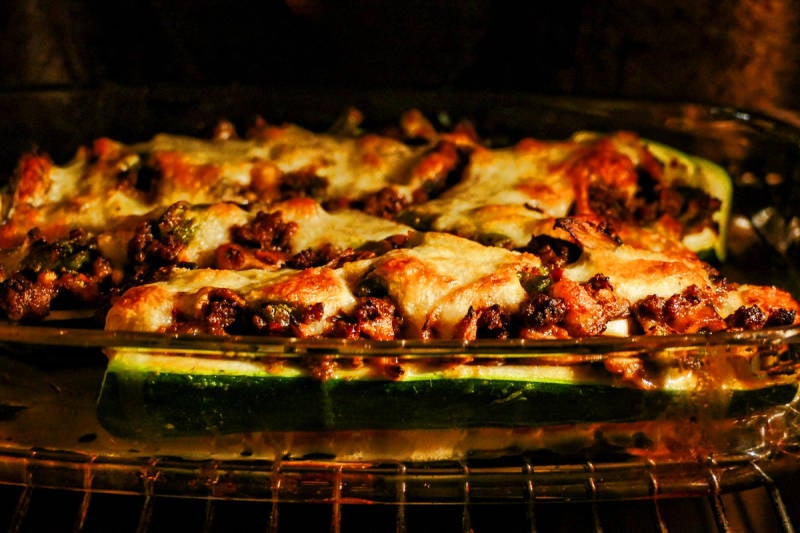 Ovenschaal invetten de uitgeholde courgette in de schaal