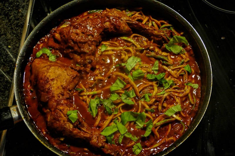 Verse kruiden in de pan(niet de basilicum die gaat er op het laatst bovenop) deksel erop en laat een uurtje pruttelen.