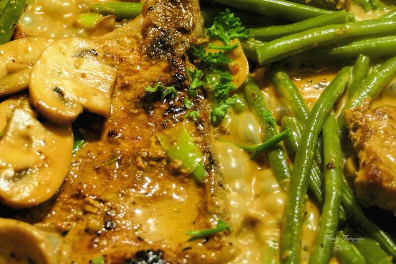 Lekkere pan vol eten romig met karbonaadjes ,champignons ook de boontjes heb ik erbij gedaan zodat het ook de lekkere smaak van de saus zou aannemen