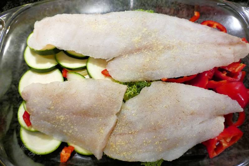 Leg de gespoelde en goed gedroogde vis boven op de groente peper uienpoeder en citroensap er boven uit knijpen