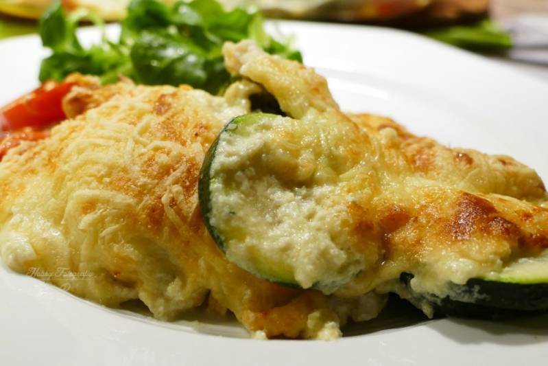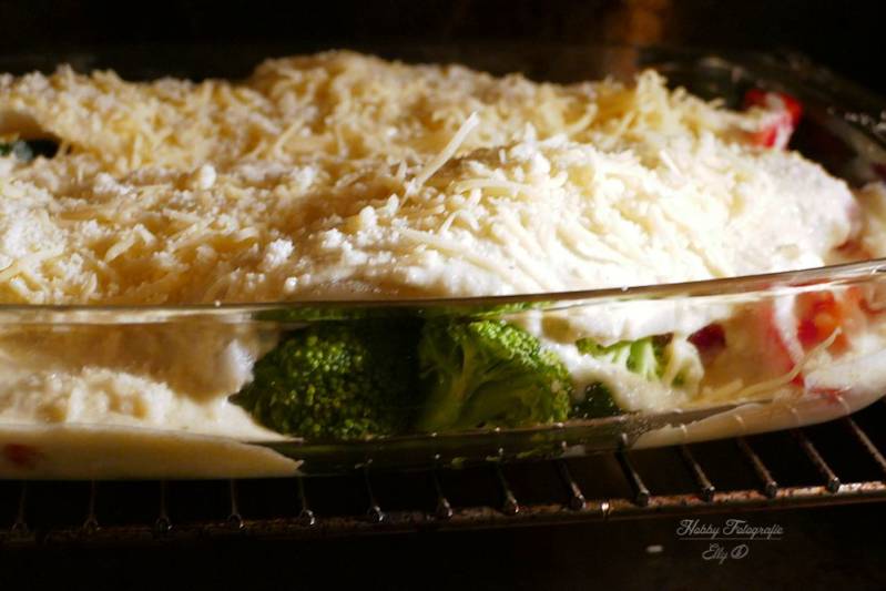 En dan wat geraspte kaas en de schaal kan de oven in voor een half uur.
