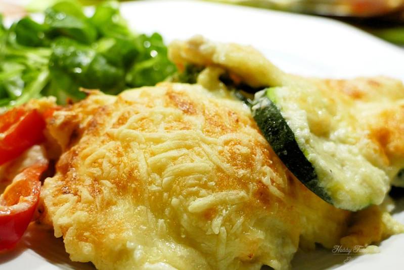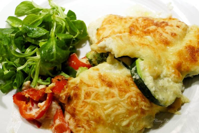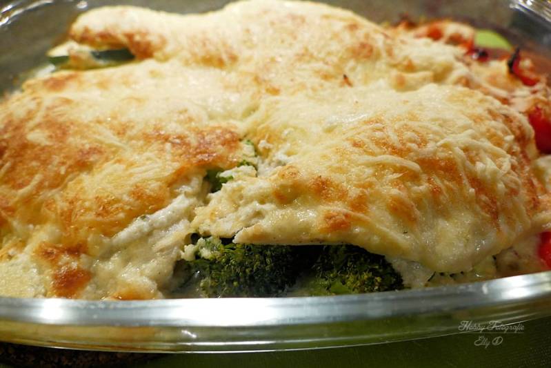 Na een half uur is alles gaar er ligt een mooi kaaskorstje over de vis en groente en we gaan lekker eten