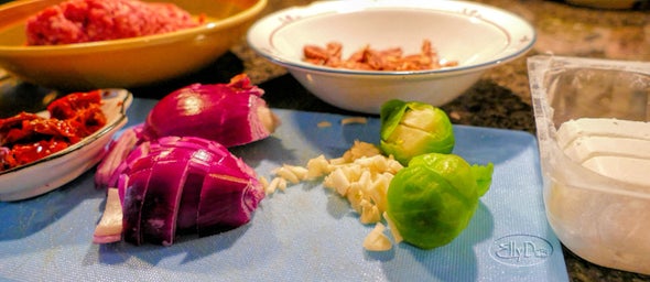 Ondertussen rode ui snijden en knoflook in kleine stukjes