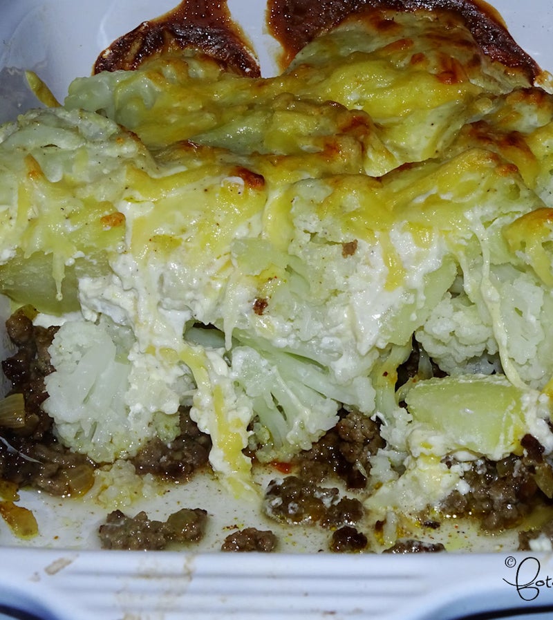 Bloemkool met gehakt en aardappel allemaal in èèn schaal en de oven in.