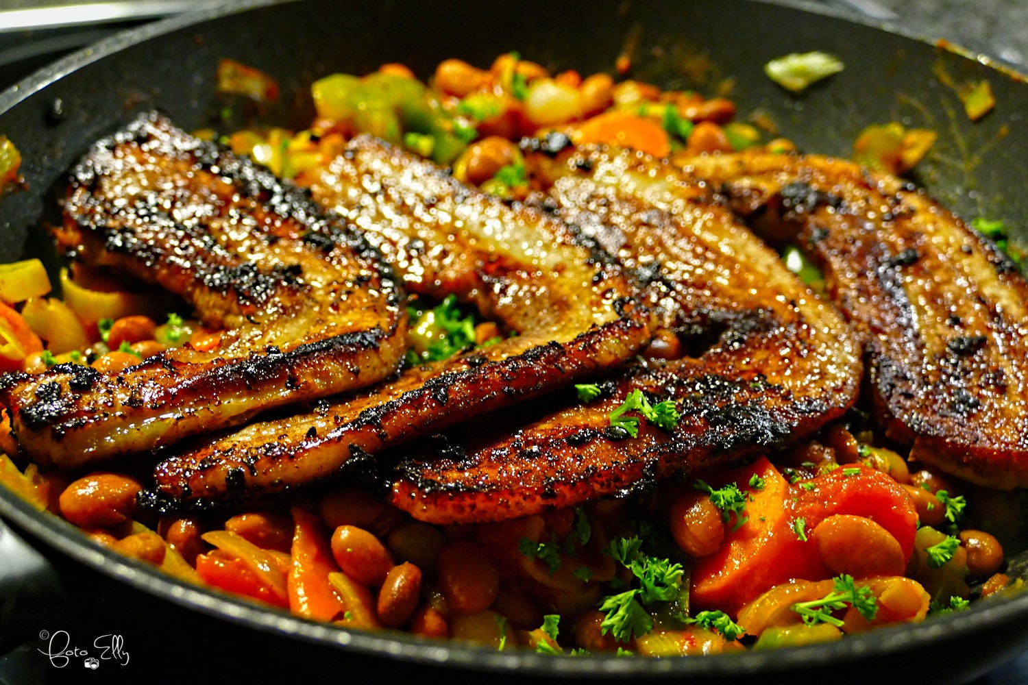 Als de speklappen mooi bruin gebakken zijn op de bruine bonen leggen