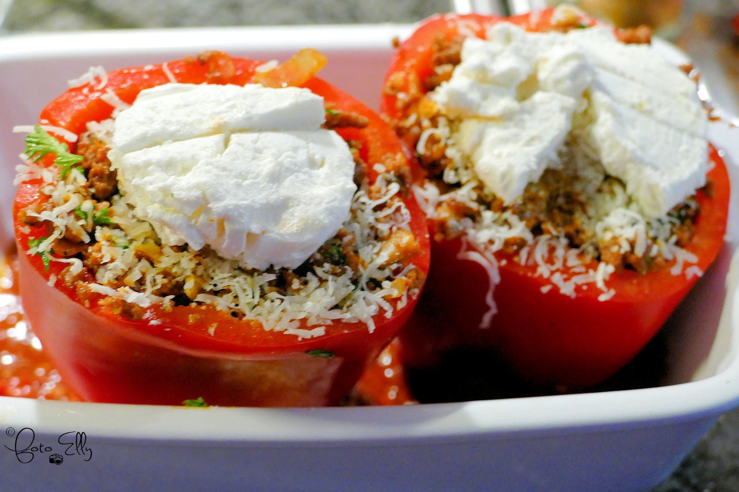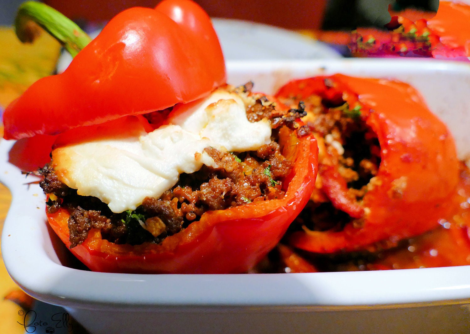 Voor de zaterdag een lekkere rode paprika gevuld met rundergehakt er bovenop lekker geitenkaas ,mjammie