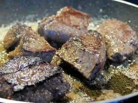 De biefstukjes worden zo van binnen warm maar blijven rose