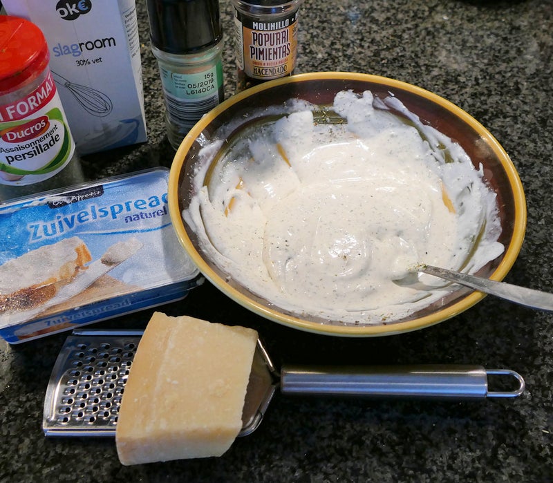 Half gare bloemkoolroosjes in de ingevette ovenschaal,het roommengsel erover en rasp er nog wat Parmezaanse kaas over