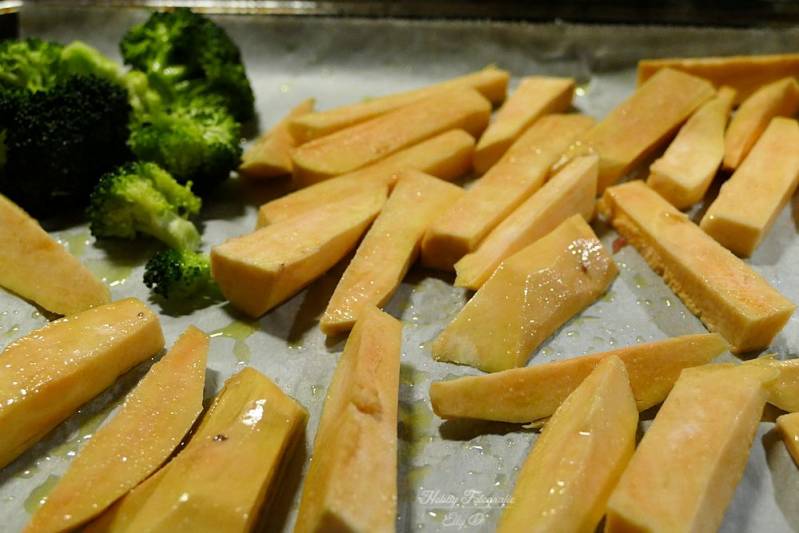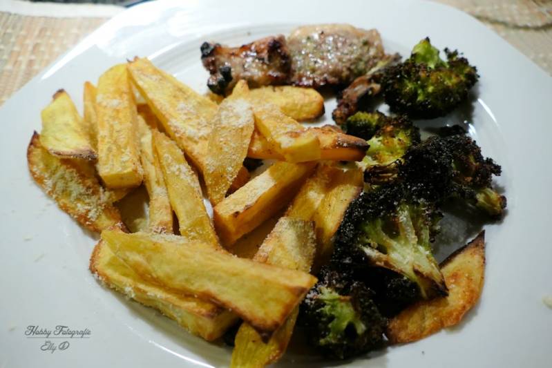 bakpapier op de plaat leggen ,en de aardappelfrietjes erop, ik had er ook wat broccoli bij gelegd