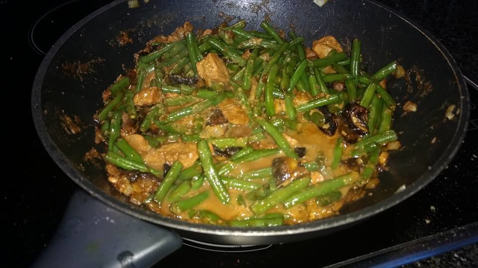 als ze gaar zijn bij de boontjes in een schaal ,in een kommetje wat ketjap met citroensap en een beetje sambal door elkaar roeren ,dit mengsel door de bonen champignons roeren.