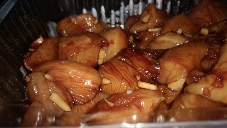Champignons schoonmaken in stukjes snijden en bakken met wat gesneden