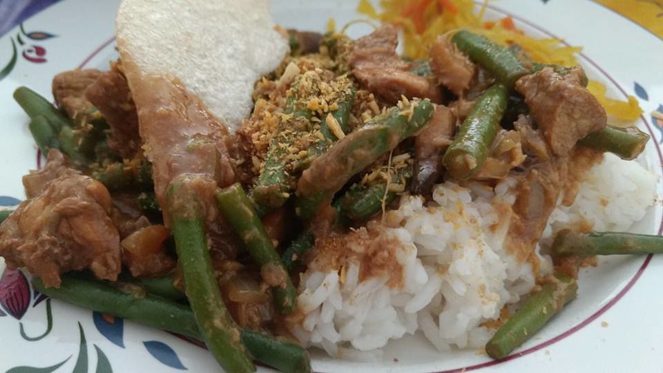 lekker met witte rijst ,gebakken uitjes en wat zoetzure groente en een stukje emping (zoutarm).