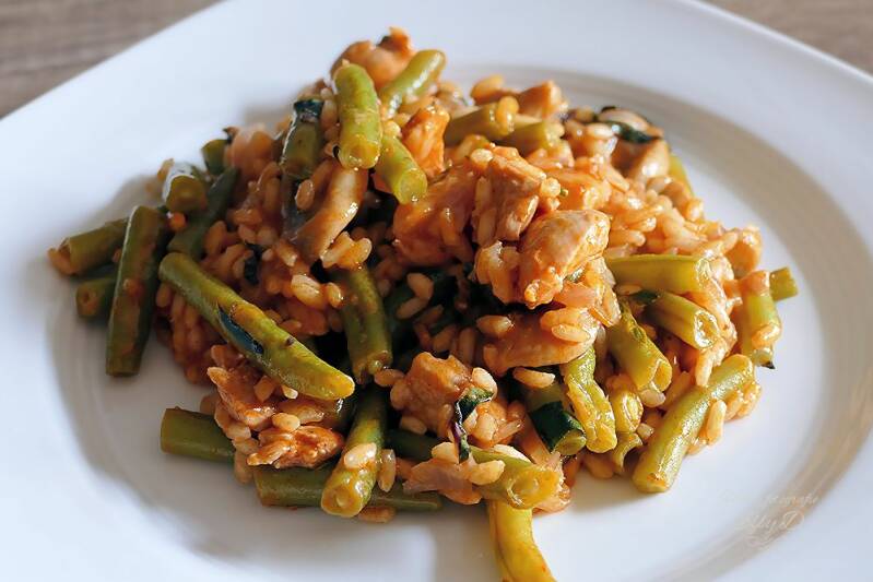 Risotto met gemarineerde kip ,champignons en boontjes.