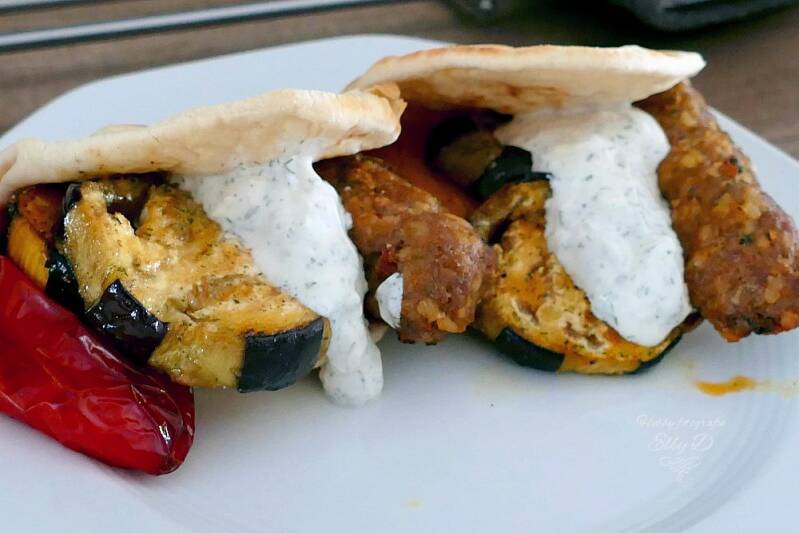 Flatbread met gehaktkebab gegrilde groente en yoghurtsaus