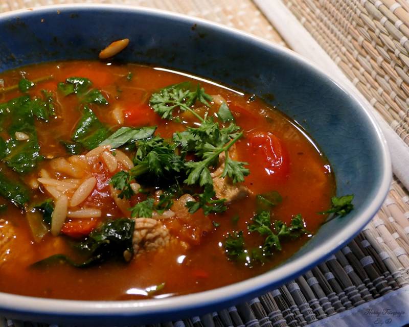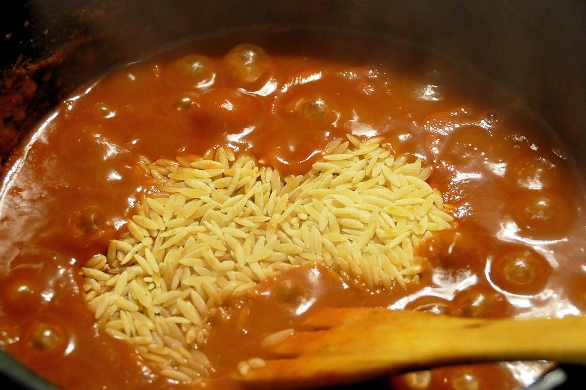 Tomatenpuree erbij, bouillon erbij halve liter,even goed heet laten worden en dan de orzo erbij