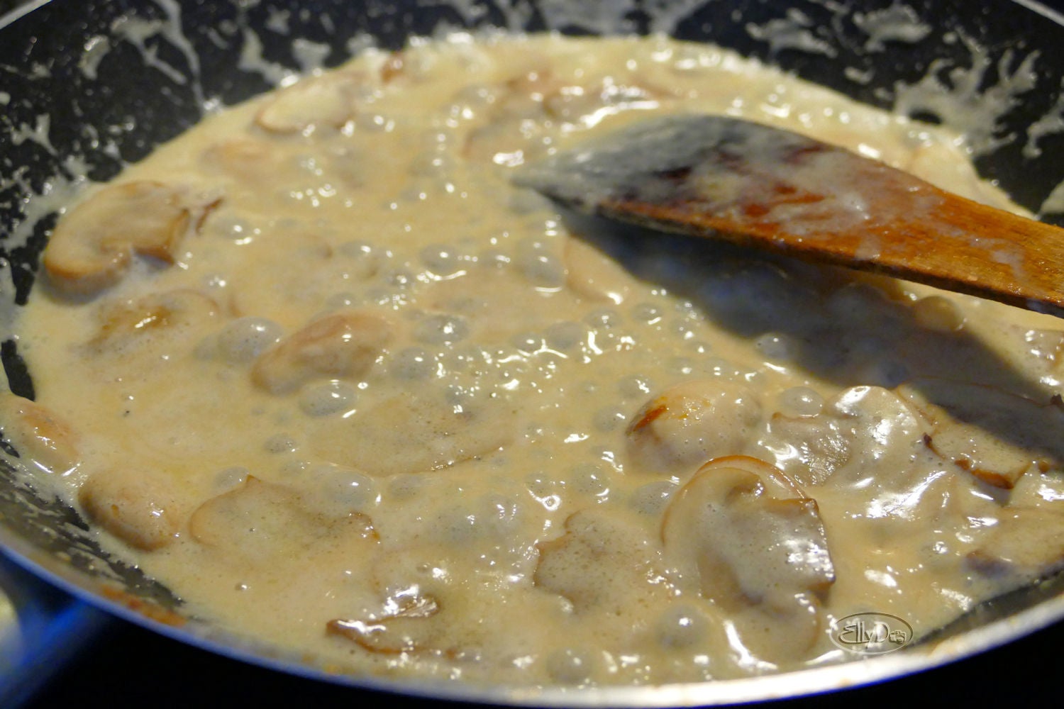 roomboter in de koekenpan en champignons even gaar bakken en dan de kook room erbij