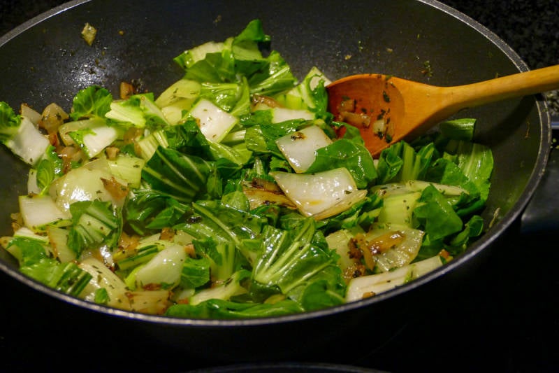 Paksoy allemaal in de pan kruiden erover en op het laatst de ketjap en nog even mee laten bakken