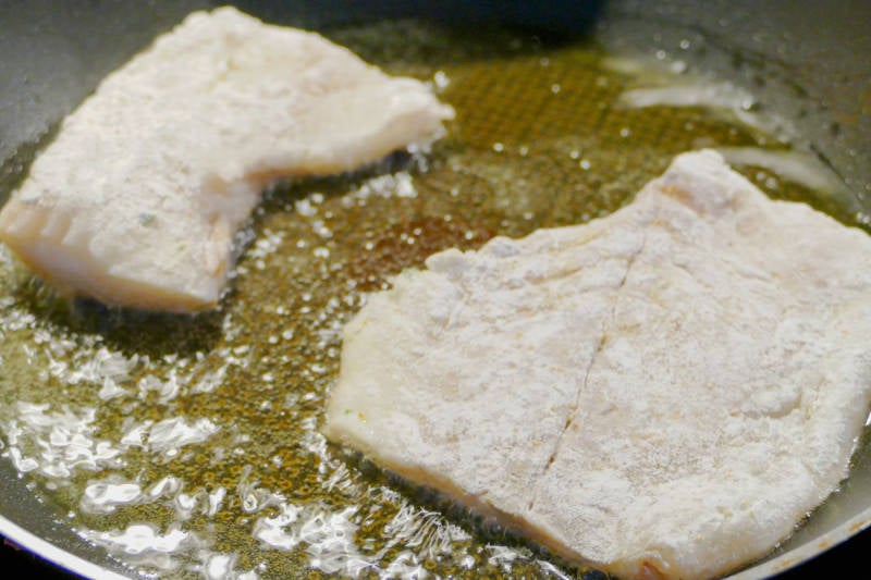 Ondertussen citroensap over de vis en peper erop en even door de bloem halen.