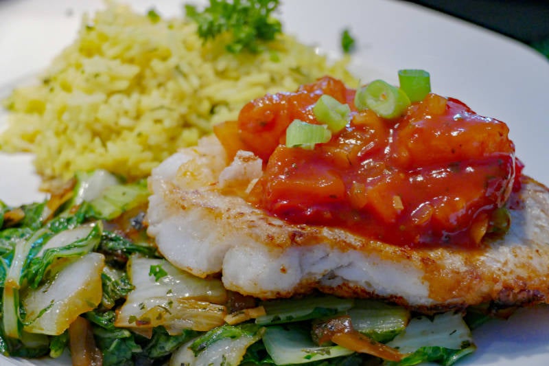 Vandaag Kabeljauwfilet ,paksoi gewokt en een heerlijk zoetzure saus ,we aten er rijst bij en komkommersalade