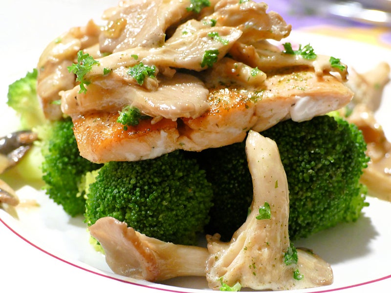 Op je bordje eerst brocoli, de zalm en als laatste het paddestoelen mengsel bovenop.