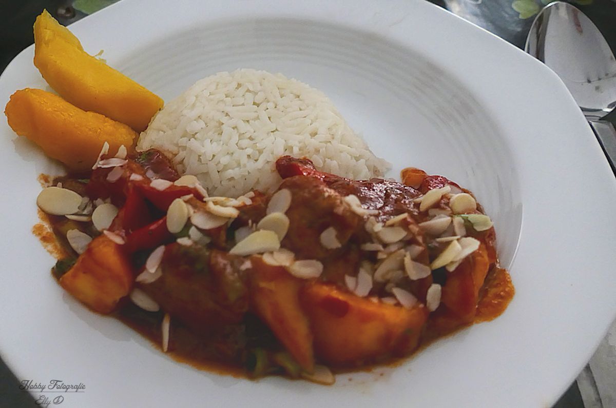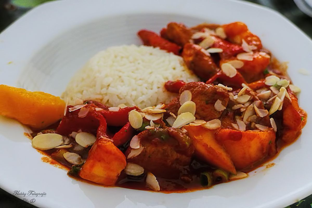 Tomatenpuree ,z/a ketjap en gembersiroop sambal en wat sap van het fruit uit blik (anders witte wijn) in de wok en de halve bouillontablet
