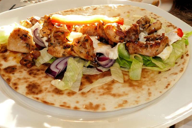 Wrap op je bord , sla ui en paprika erop wat lekkere knoflooksaus en vlees dan oprollen en